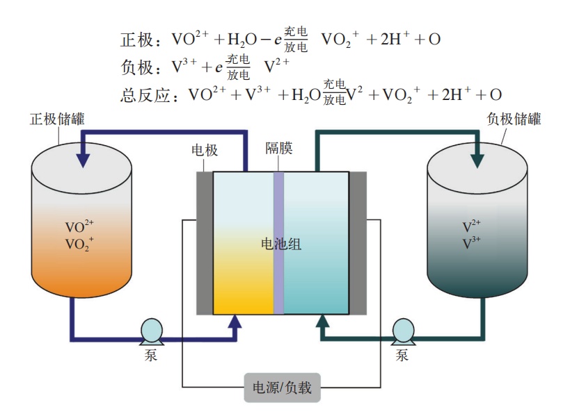 釩電池利用VO2+/VO2+、V2+/V3+兩對氧化還原電堆的釩離子溶液作為正極和負極的活性物質(zhì),分別儲存在各自的電解液儲罐中。對電池進行充/放電時,電解液通過泵的作用,由外部儲液罐分別循環(huán)流經(jīng)電池的正極室和負極室,并在電極表面發(fā)生氧化和還原反應,實現(xiàn)對電池的充/放電。
